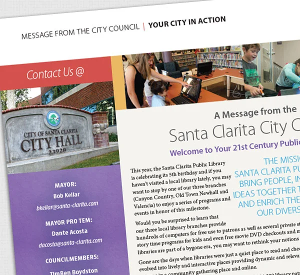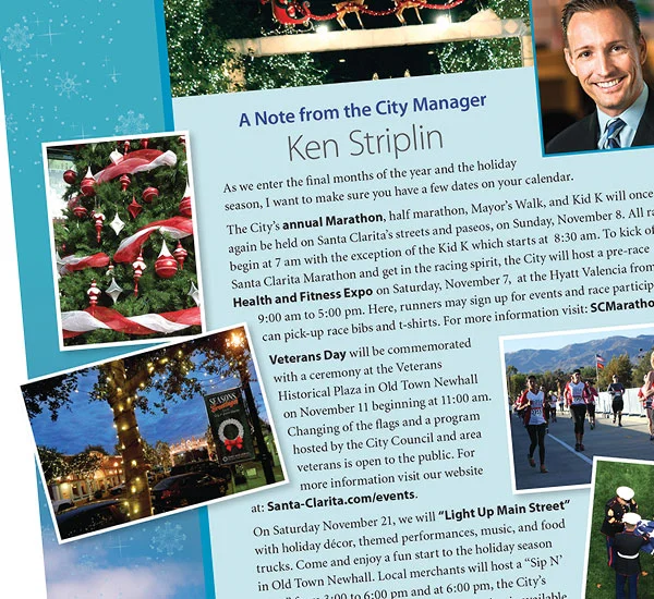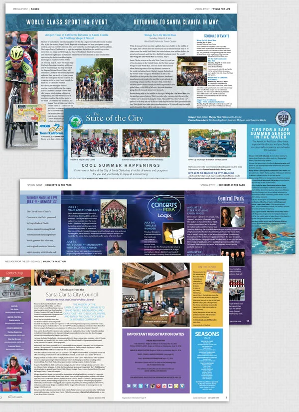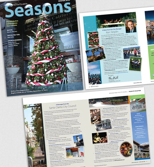 Design, art direction, and production of the City of Santa Clarita's Seasons Magazine, an 80-page quarterly publication with a print circulation of 77,000 and online capabilities for viewing and registration. As part of our contract, we are responsible for branding and managing the publication, as well as expanding a look which is both engaging and informative. Highlights include pages of editorial features, information on City classes, libraries, activities, programs, events, and more. We have been designing this publication for the past 10 years.